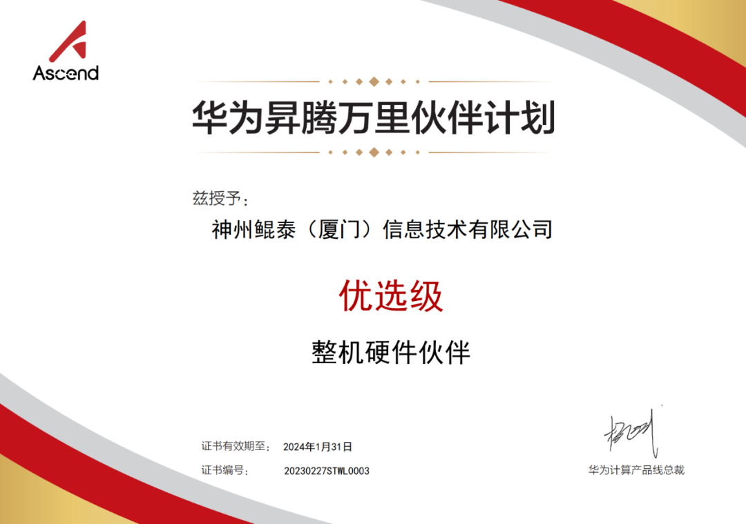 近日,星空·综合体育数码旗下神州继获得华为鲲鹏领先级整机硬件伙伴认证之后,再获华为昇腾优选级整机硬件伙伴认证!这是神州与华为昇腾深化合作的硕果,也代表着星空·综合体育数码信创业务在AI领域获得生态伙伴的充分认可。